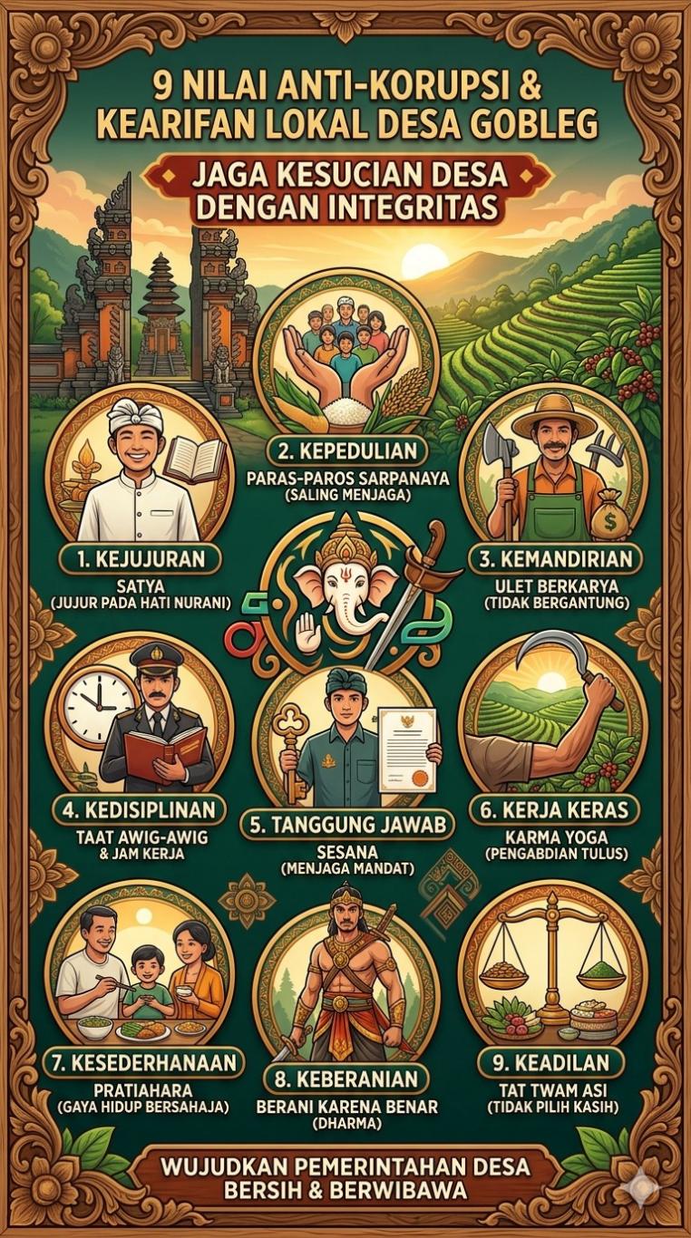 Desa Gobleg, dengan sejarah panjangnya sebagai bagian dari Catur Desa (Dalem Tamblingan), memiliki tatanan nilai moral yang sangat kuat. Melawan korupsi bukan hanya soal hukum negara, tetapi juga soal menjaga kesucian (kesucian) tanah kelahiran dan martabat krama desa.